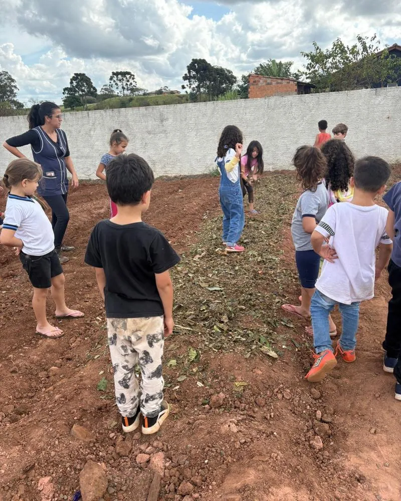 Após a teoria, a prática! Com luvas e muita disposição, os estudantes participaram ativamente da limpeza e cobertura dos canteiros da escola. O solo foi cuidadosamente preparado para receber as futuras plantações, um trabalho que envolveu cooperação e o desenvolvimento de habilidades motoras, além de conectar as crianças diretamente com a terra e o processo de cultivo.