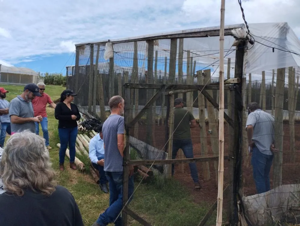 Um dos momentos mais aguardados e enriquecedores do evento foi a visita às estufas da propriedade do produtor Douglas. Após as palestras, os participantes puderam acompanhar na prática os desafios, acertos e aprendizados do produtor anfitrião. Essa imersão no dia a dia da produção orgânica, com a observação de técnicas e soluções aplicadas, proporcionou um rico compartilhamento de conhecimento e inspirou os agricultores a implementar novas abordagens em suas próprias propriedades.