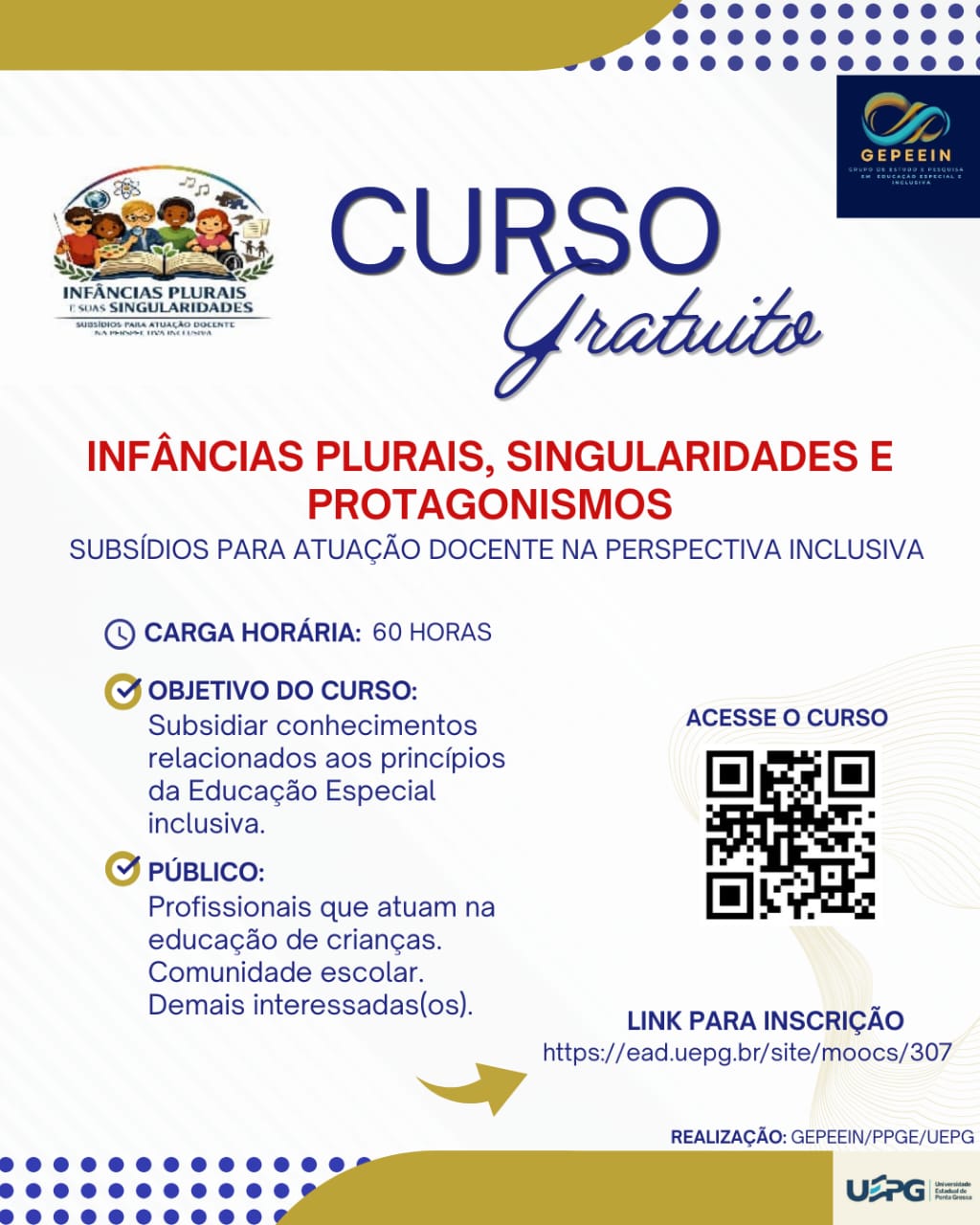 Cartaz de divulgação de curso com fundo branco e elementos gráficos em azul e dourado. No topo, há duas logos: à esquerda, uma ilustração de crianças ao redor de um livro com o título “Infâncias Plurais e suas Singularidades”; à direita, a logo do Gepeein (Grupo de Estudos e Pesquisa em Educação Especial Inclusiva). Ao centro, em destaque, está o título “CURSO Gratuito” e logo abaixo, em letras vermelhas, lê-se: “Infâncias Plurais, Singularidades e Protagonismos”. Abaixo, em azul, está a descrição: “Subsídios para atuação docente na perspectiva inclusiva”. Na parte inferior esquerda, aparecem as informações: Carga horária: 60 horas; Objetivo do curso: subsidiar conhecimentos relacionados aos princípios da Educação Especial inclusiva; Público: profissionais que atuam com crianças. Comunidade escolar. Demais interessadas(os). À direita, há um QR Code com a indicação “Acesse o curso”. Na parte inferior central, há o link para inscrição: https://ead.uepg.br/site/moocs/307 . No rodapé, está a informação de realização: Gepeein/PPGE/UEPG, junto à logo da UEPG.