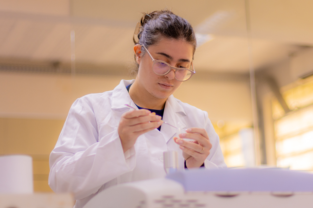 O espectrofotômetro FT-IR Spectrum permite obter uma “impressão digital” molecular das amostras, conforme explica a coordenadora do Labmu-Cibios, professora Viviane Nogaroto Vicari. “O equipamento possibilita a identificação de compostos, avaliação de pureza e detecção de contaminantes de forma rápida e confiável. O FT-IR se destaca pela agilidade das análises, pela necessidade mínima de preparo das amostras e por ser uma técnica não destrutiva, contribuindo significativamente para o avanço tecnológico e científico”, ressalta. Dentre as aplicações do espectômetro estão a identificação de compostos orgânicos e inorgânicos; análise de grupos funcionais; avaliação da pureza dos materiais; detecção de contaminantes; e monitoramento de reações químicas. Com o equipamento, pesquisadores podem analisar compostos sólidos (pós, comprimidos, polímeros); líquidos; filmes finos; e gases (com célula apropriada).