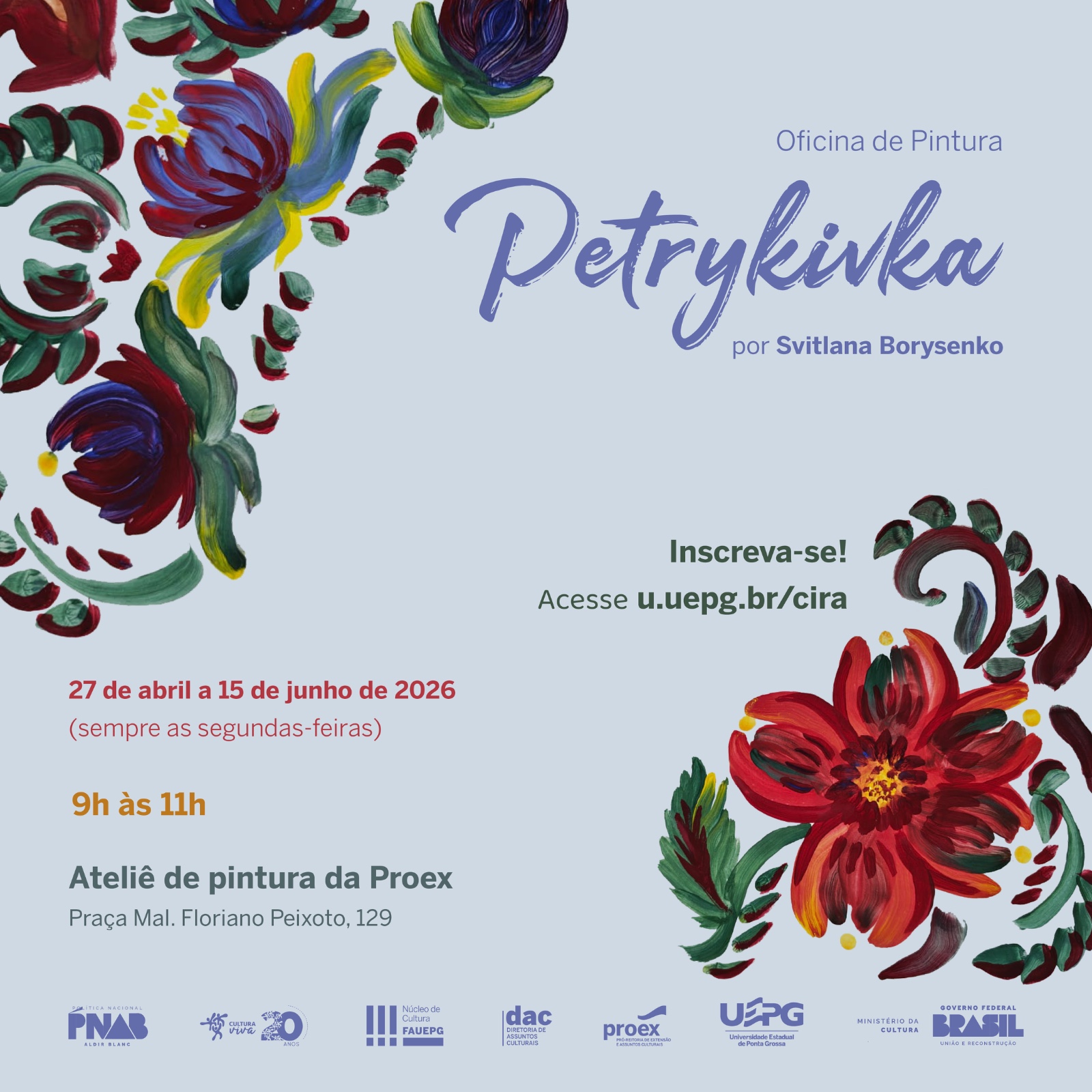 A Pró-Reitoria de Extensão e Assuntos Culturais da Universidade Estadual de Ponta Grossa (Proex-UEPG) oferece um curso de pintura de Petrykivka, um método ucraniano utilizado na decoração de casas e outros itens. Lecionado pela professora Svitlana Borysenko, pesquisadora bolsista do Programa Paranaense de Acolhida aos Cientistas Ucranianos, o curso terá oito encontros semanais entre 27 de abril e 15 de junho. Os encontros abordarão a história e o simbolismo da pintura, a fauna e a flora retratados, a Petrykivka feita no Brasil e o desenvolvimento de um projeto final. As aulas acontecem na segunda-feira, das 9h às 11h, no ateliê de pintura da Proex. A matrícula pode ser feita por formulário e a taxa de inscrição custa entre R$ 70 e R$ 140, com o material incluso.